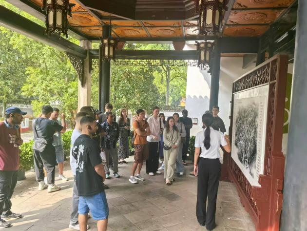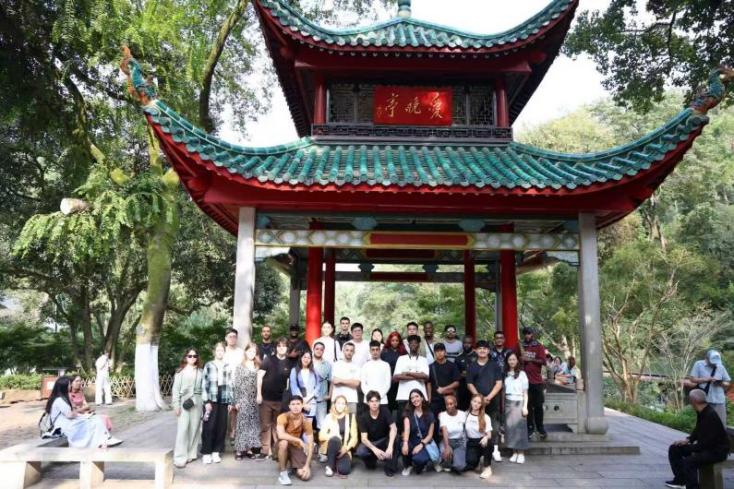 活动首站抵达中国四大书院之一的岳麓书院。在专业讲解员的引导下,师生们穿过赫曦台、驻足御书楼,于“惟楚有材,于斯为盛”的对联前,聆听千年学府的治学故事与湖湘文化精髓。来自巴基斯坦的留学生Wasif感叹道:“这里的每一块砖石都承载着历史,让我真切感受到中国文人对知识的尊敬与传承。”随后,一行人登临岳麓山,抵达中国古代四大名亭之一的爱晚亭。秋日暖阳下,红枫与亭角相映成趣,留学生们或用镜头定格诗意瞬间,或用中文朗诵唐诗,中外文化在山水间自然交融。